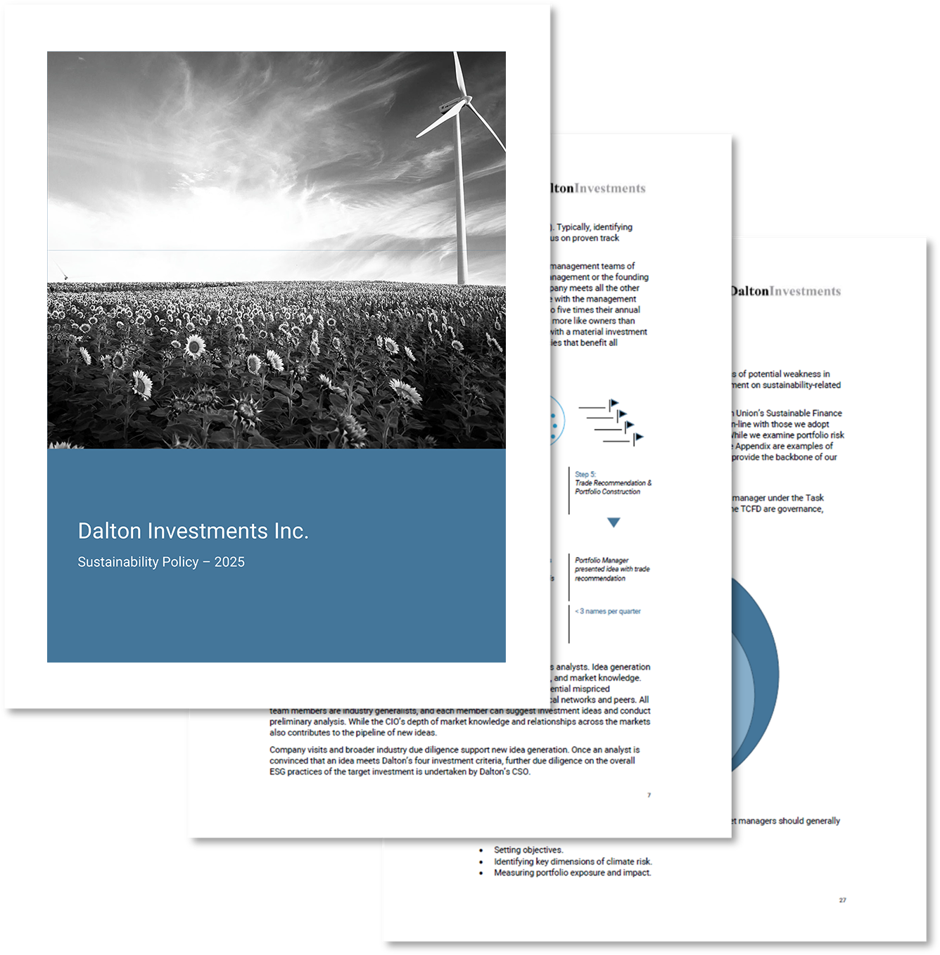 In November 2025, Dalton Investments reviewed its approach to sustainability leading to the publication of a new and comprehensive policy. The full policy can be obtained by clicking the image below.